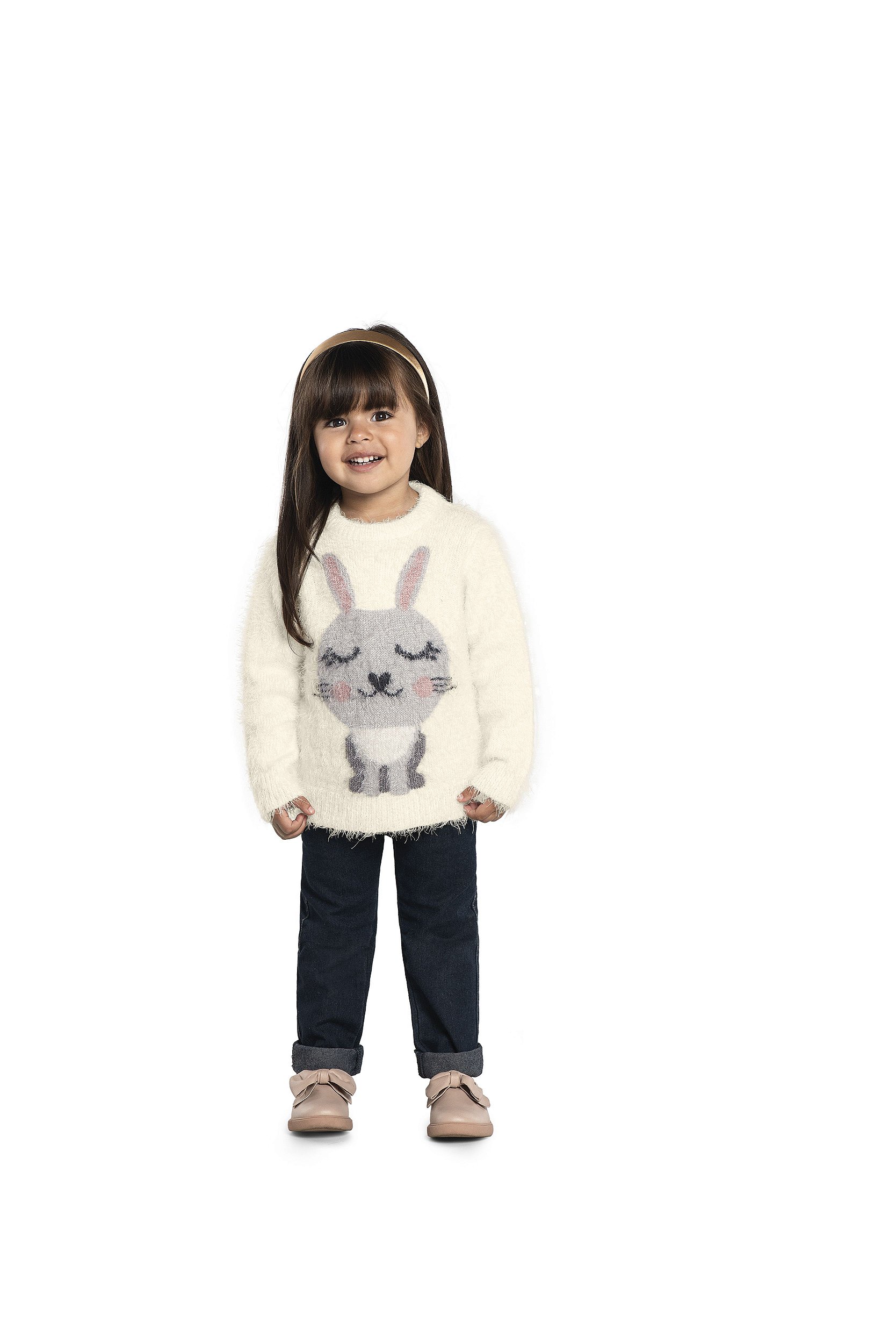 Além de confortável e versátil, este casaco é um charme, o tecido de tricô peluciado é uma delícia, super macio, além de ter uma estampa de coelhinho super fofa!