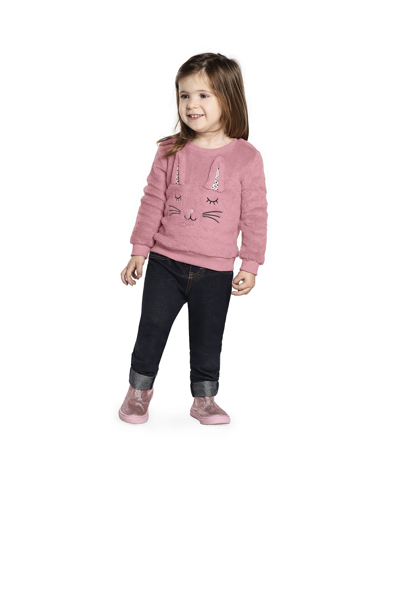 Quentinho para o inverno, o casaco de pelúcia contém estampa de coelinho, com as orelhas em alto relevo.